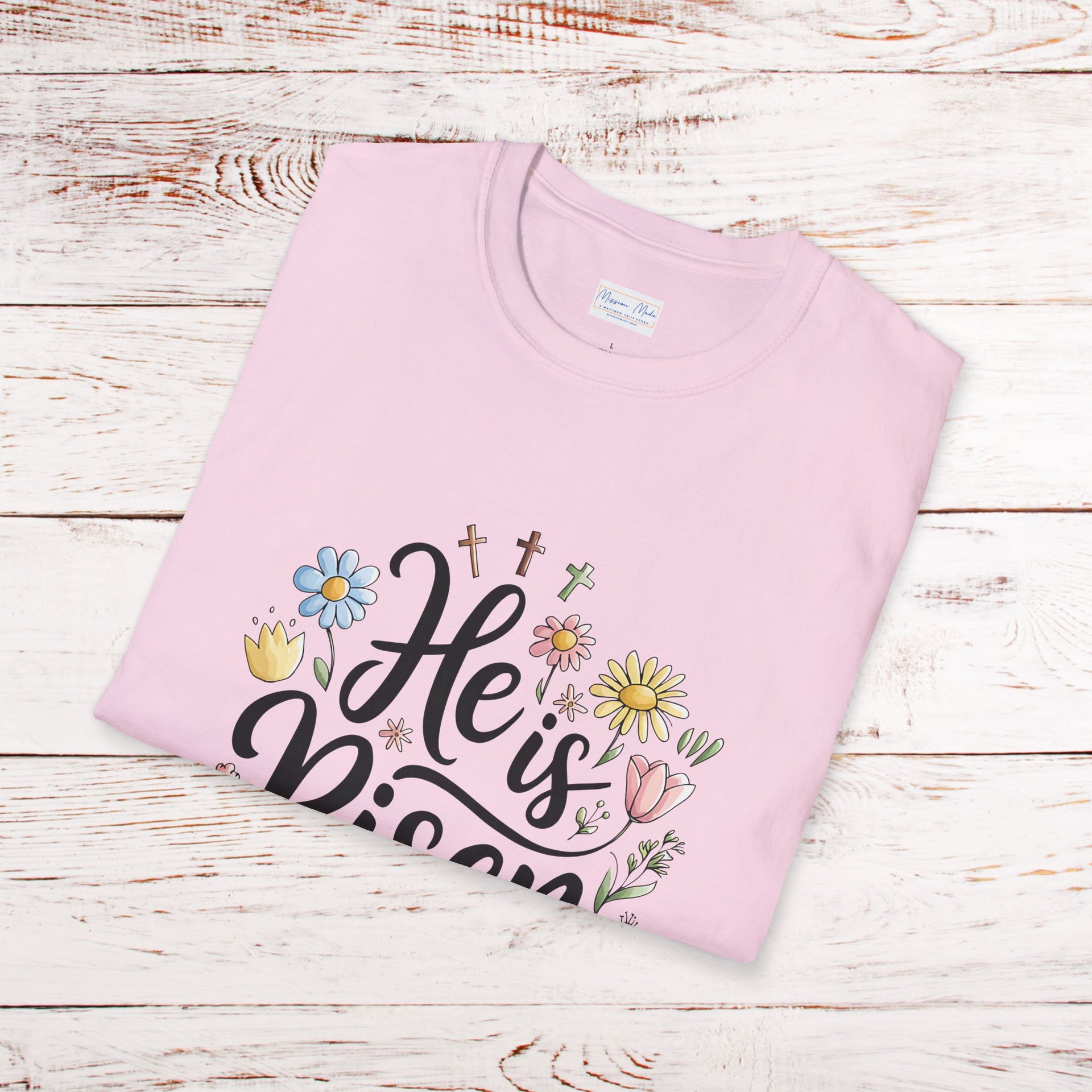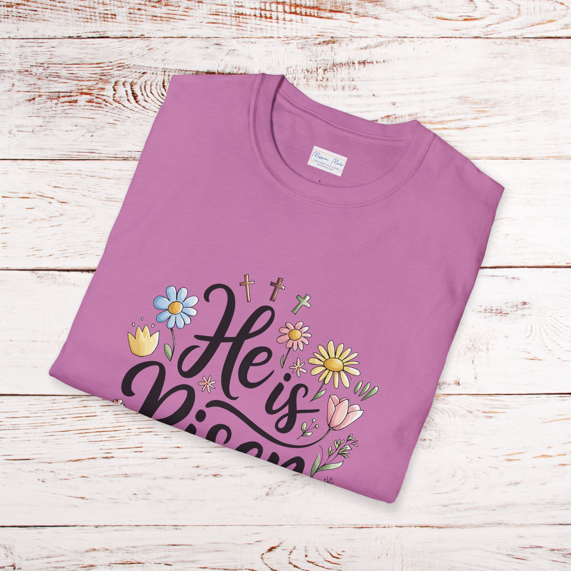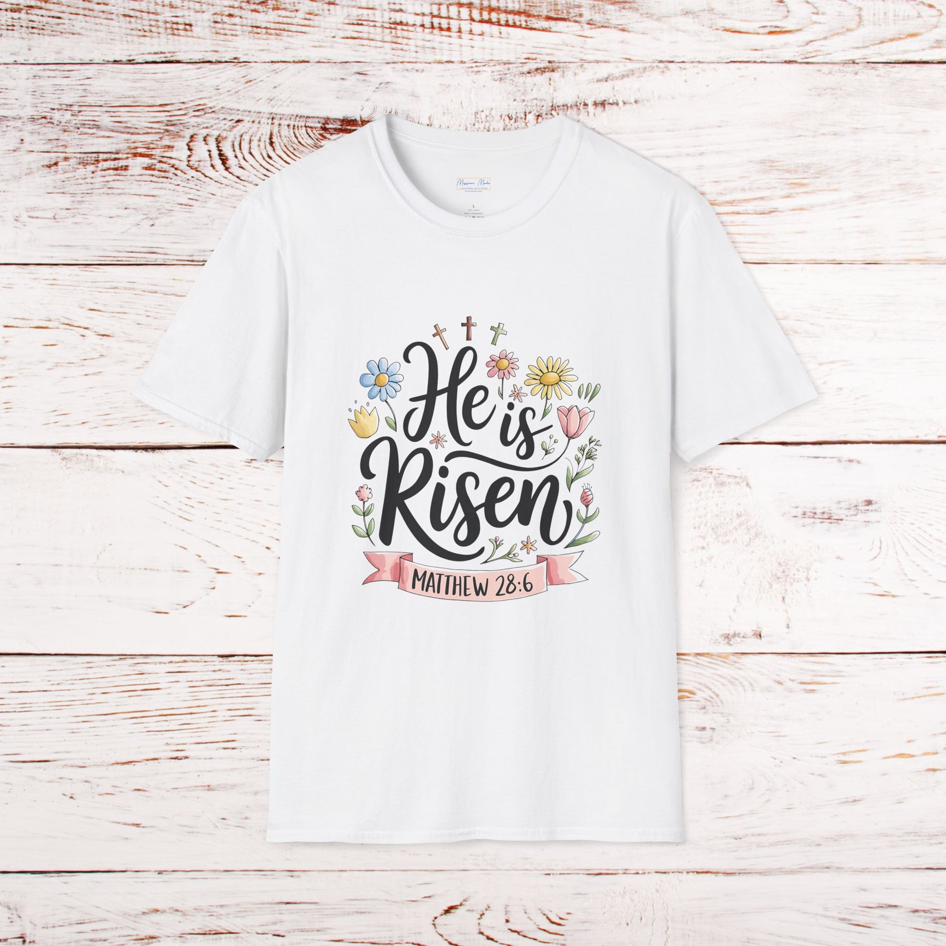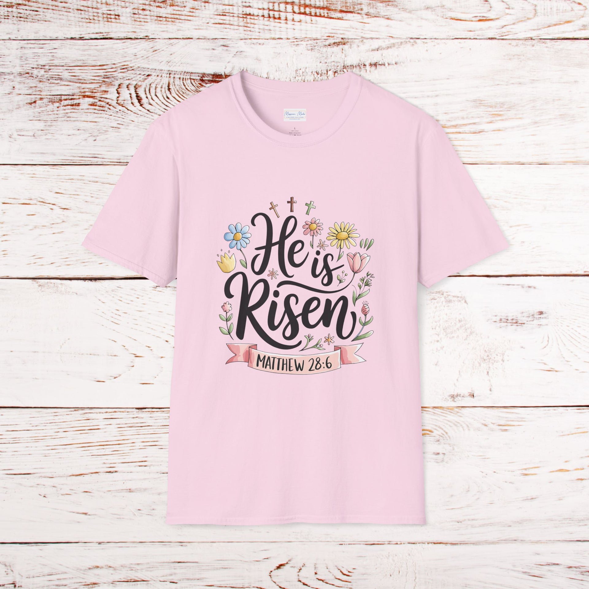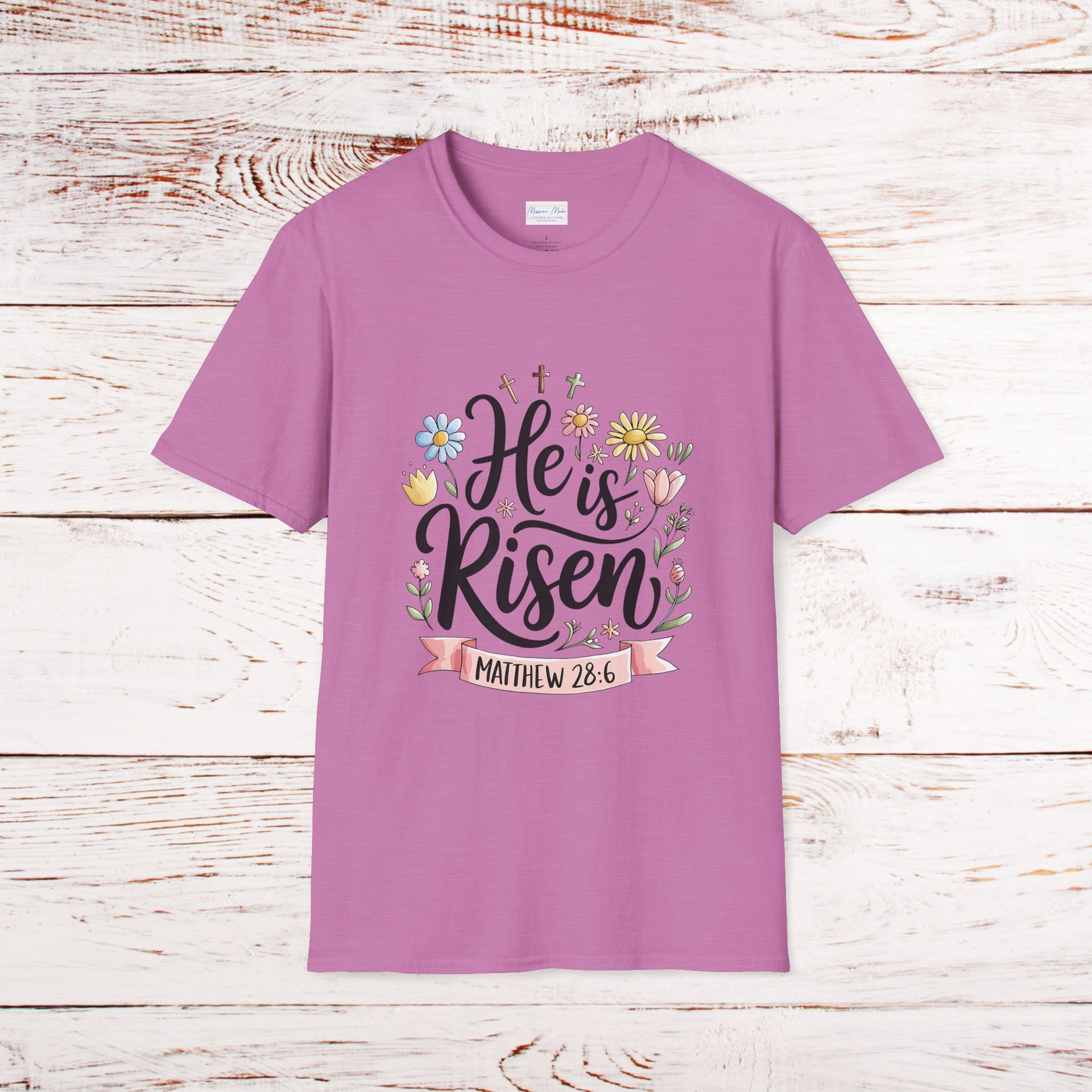 Let your faith bloom with our beautifully crafted He Is Risen – Botanical Resurrection Day Graphic Tee, designed to inspire hope and celebrate the victory of the Resurrection. Adorned with a delicate botanical-inspired graphic, three crosses and a banner with the Matthew 28:16 written within, this softstyle t-shirt combines meaningful design with everyday comfort—perfect for Easter, church services, or simply as a daily reminder of God’s unfailing love.