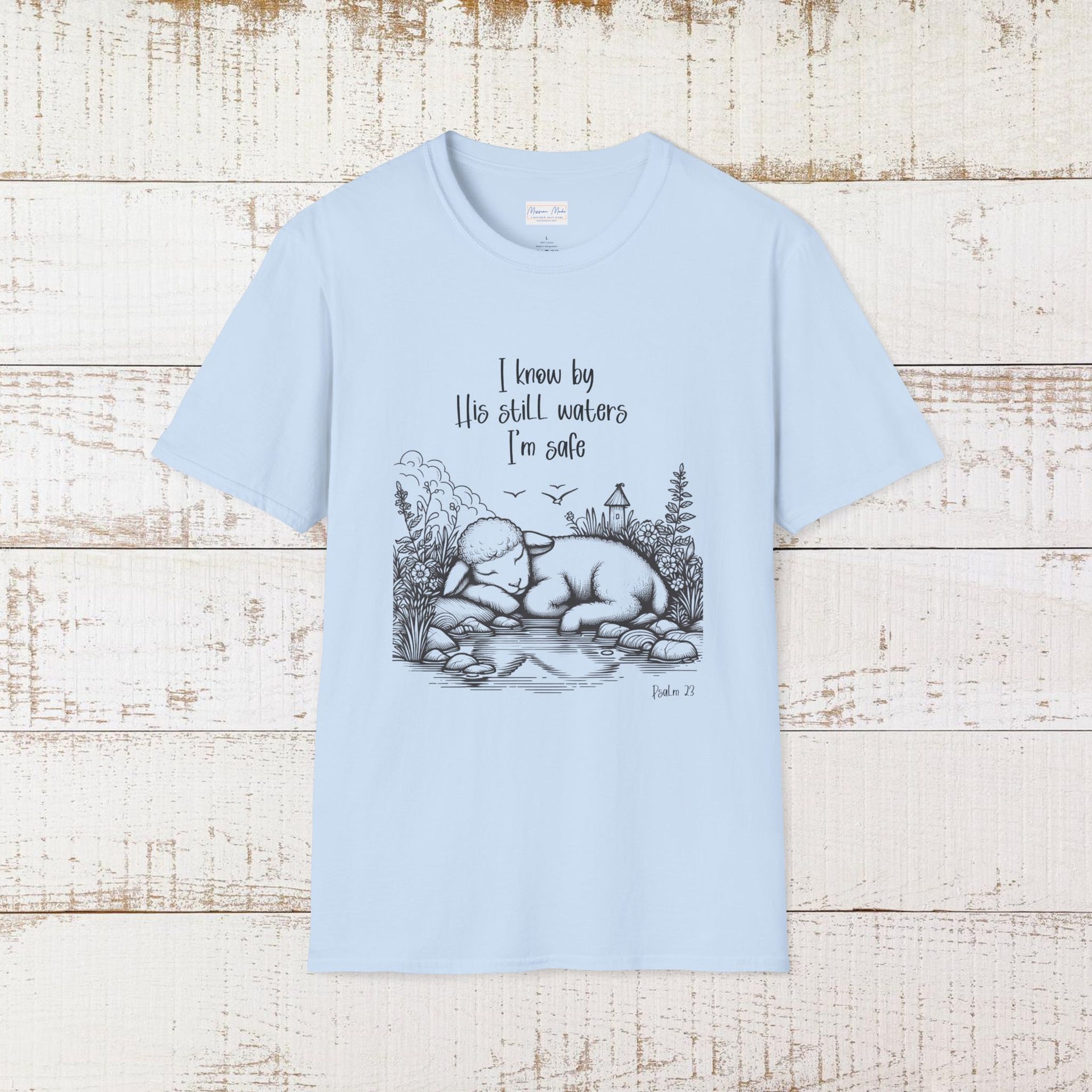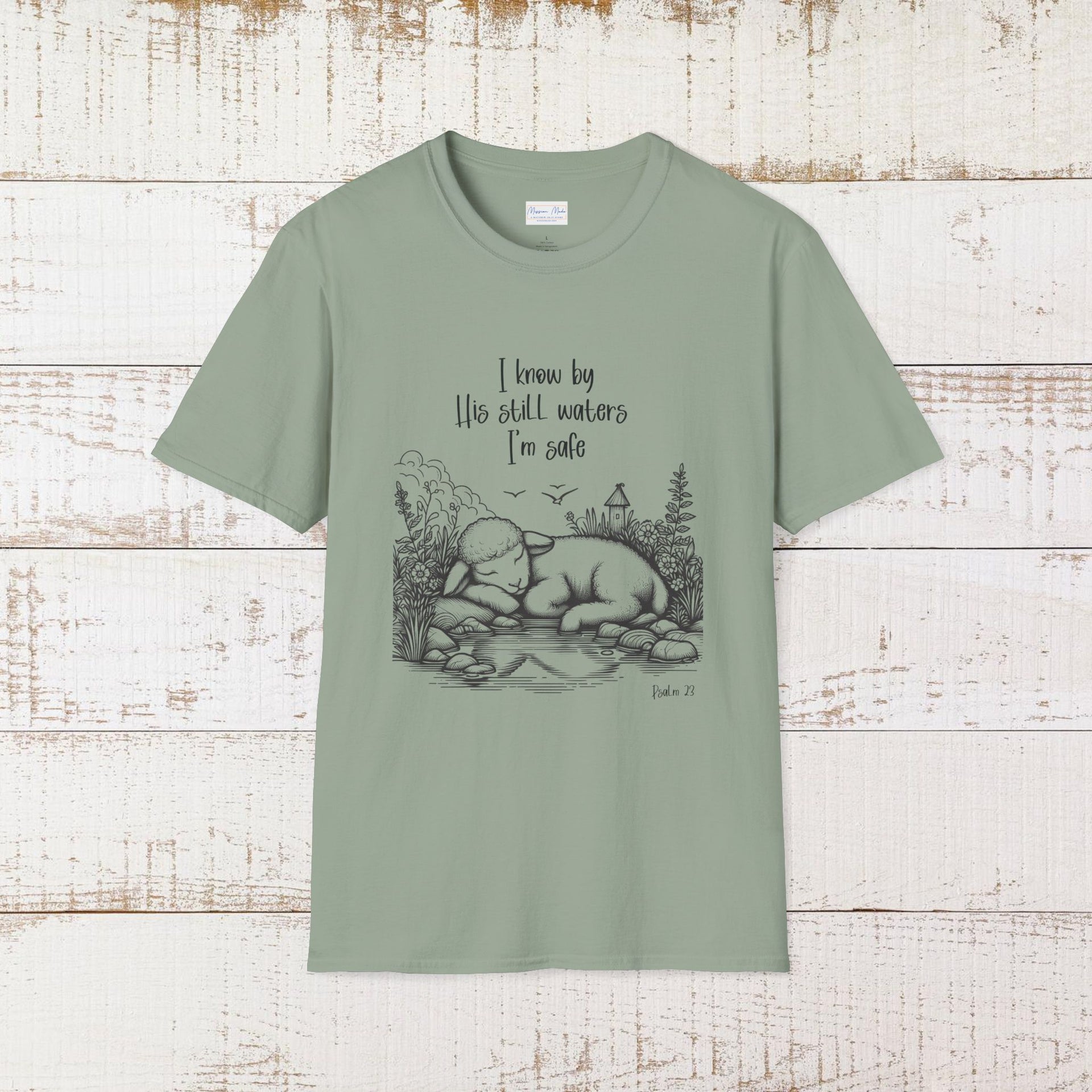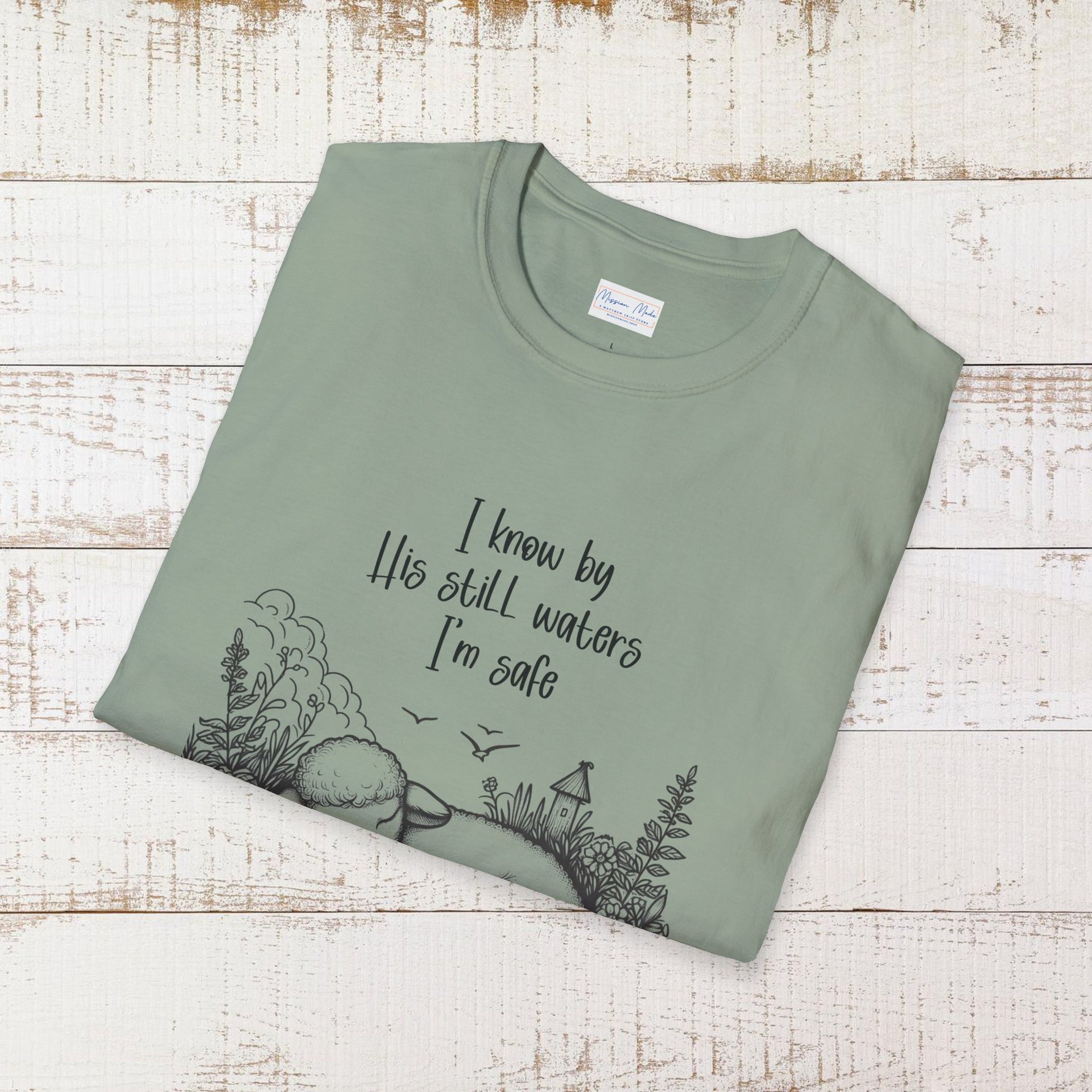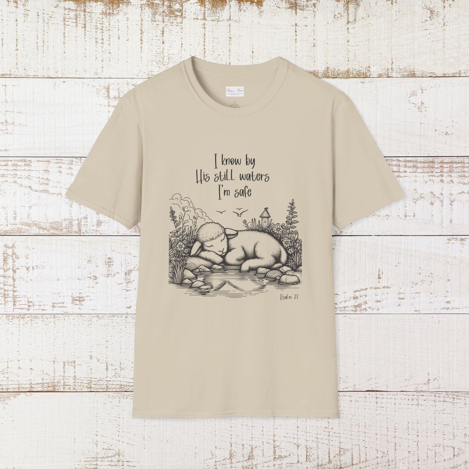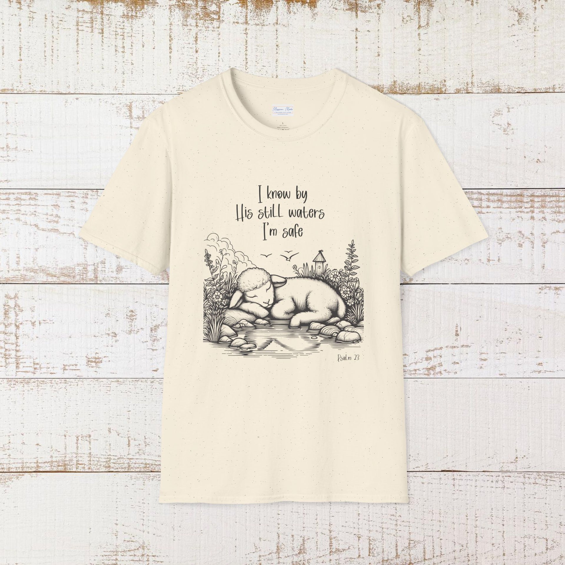 Let your soul exhale in the truth of Psalm 23 with this beautiful, faith-filled tee. Inspired by the comforting words, “He leads me beside still waters…”, this T-shirt is a gentle reminder that even in life’s chaos, God's peace surrounds and protects you.
