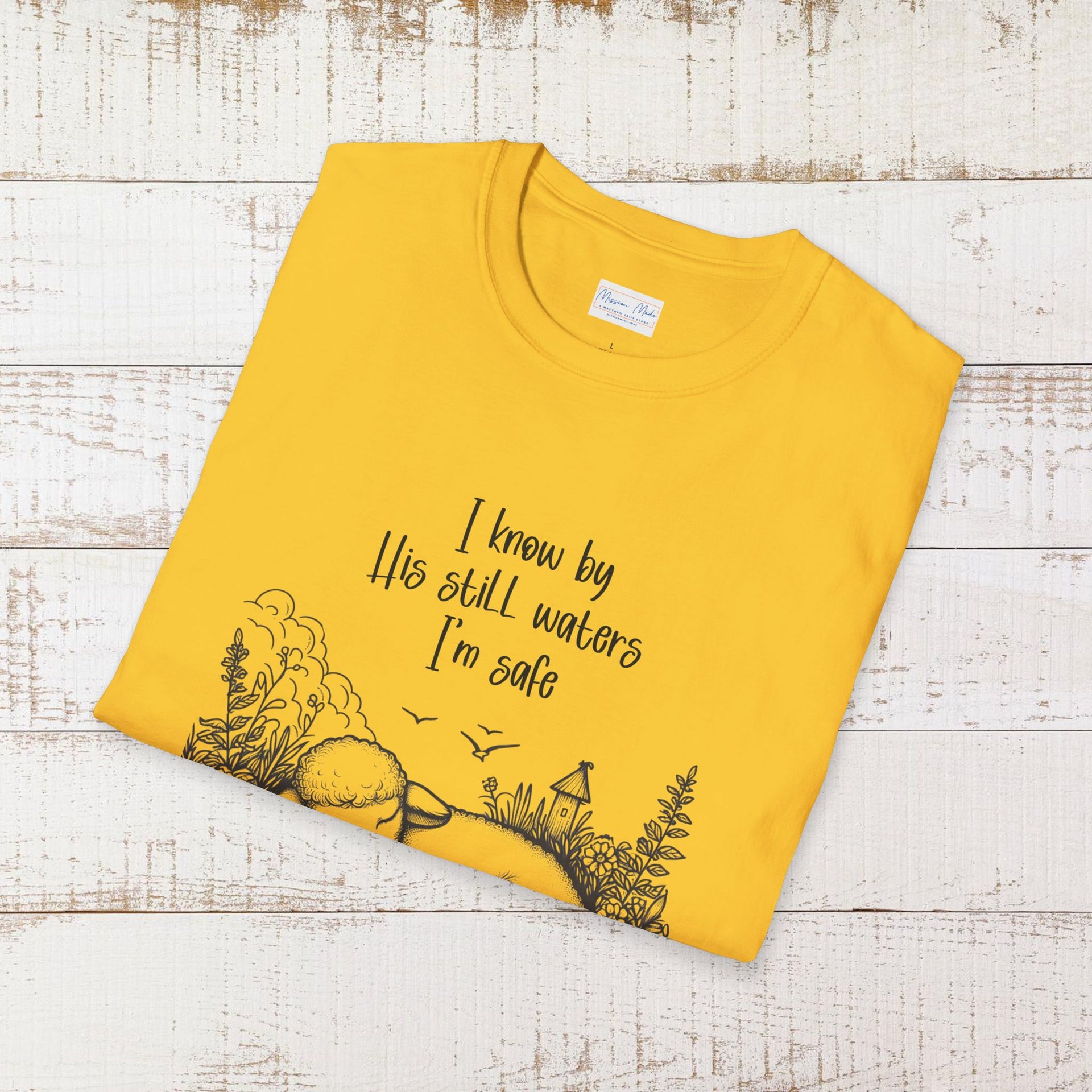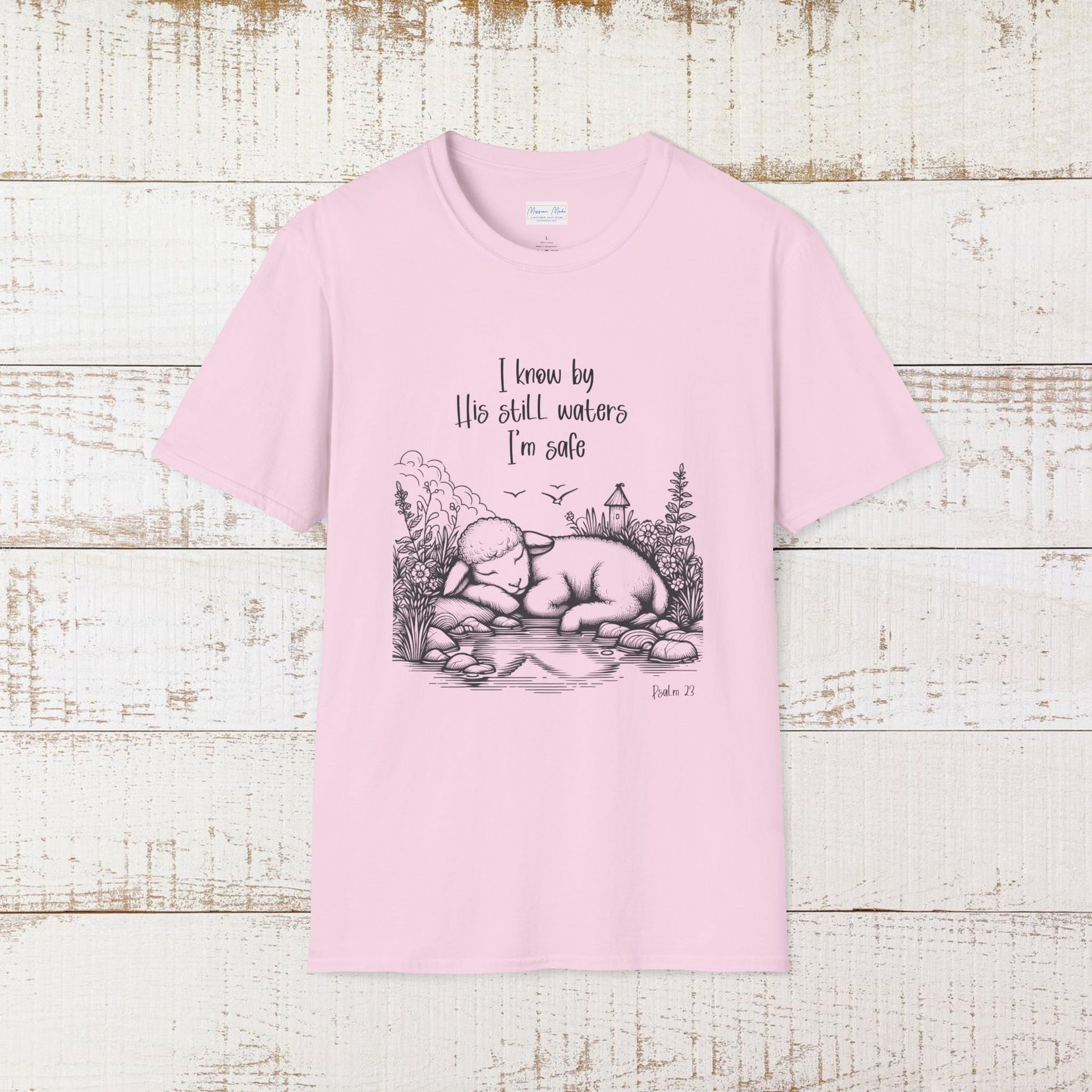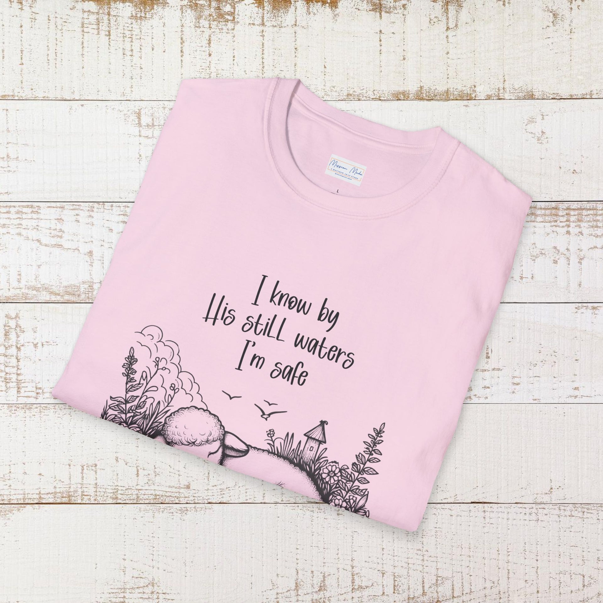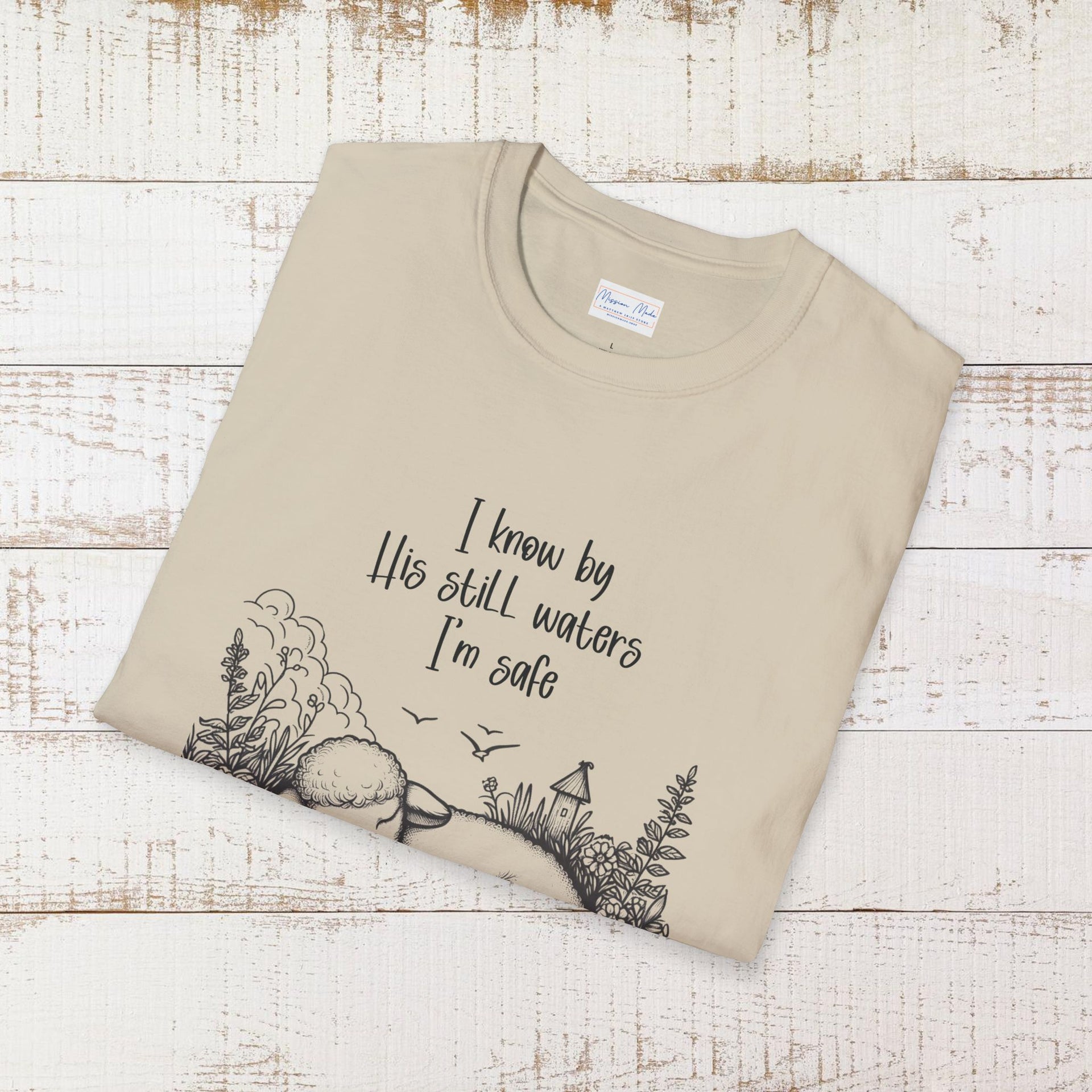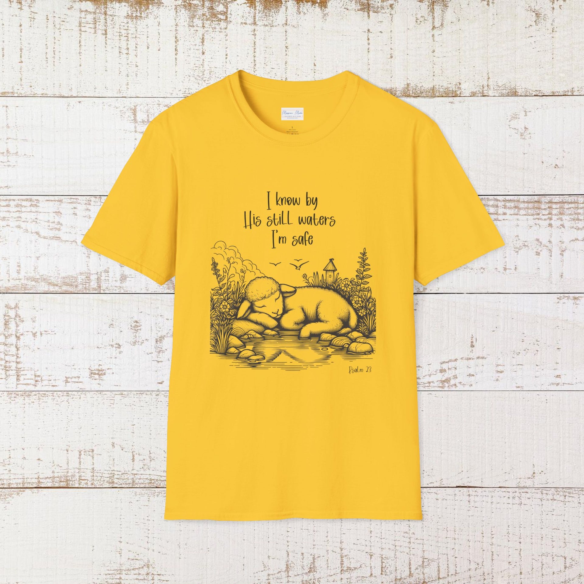 Let your soul exhale in the truth of Psalm 23 with this beautiful, faith-filled tee. Inspired by the comforting words, “He leads me beside still waters…”, this T-shirt is a gentle reminder that even in life’s chaos, God's peace surrounds and protects you.