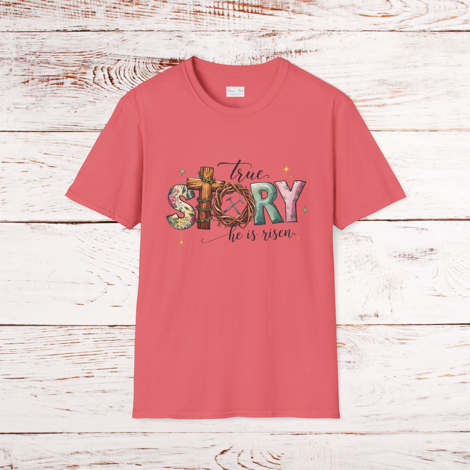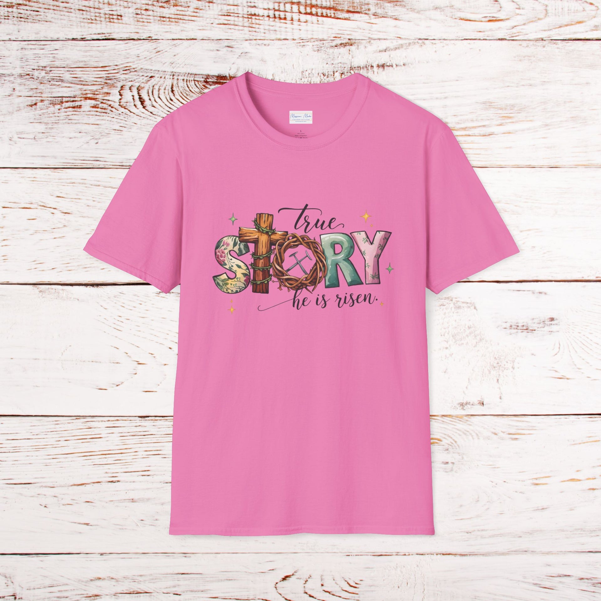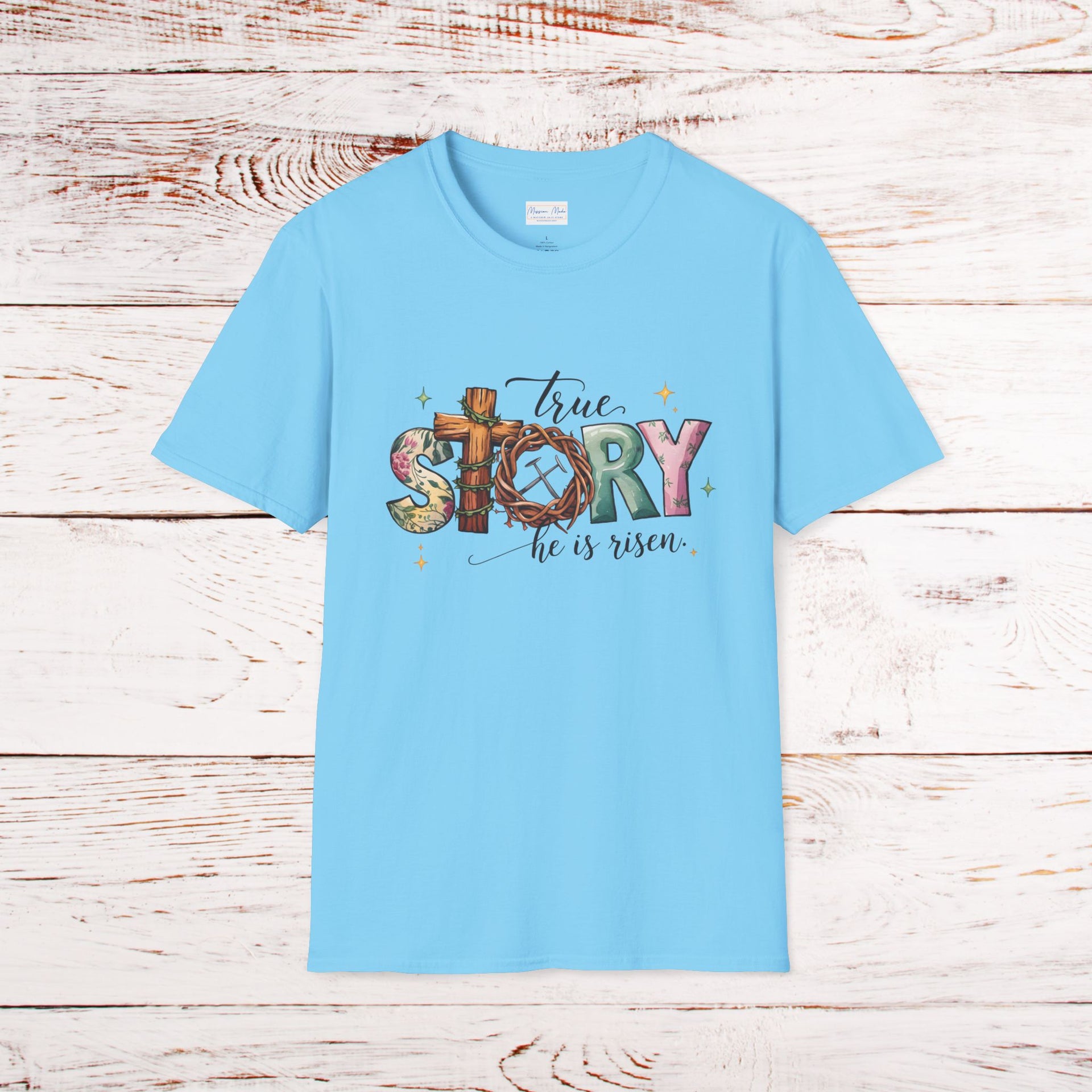 Celebrate the resurrection of Christ with this softstyle t-shirt perfect for Easter and Resurrection Day. Show your faith proudly with the 'True Story He is Risen' design. This unisex t-shirt is made from durable and smooth fabric, with a classic fit and crew neckline for versatile styling. Relevant to Christians and those celebrating Easter and Resurrection Day.